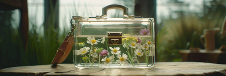 transparent purse showcasing a vibrant array of freshly painted flowers, adding a touch of whimsical charm and elegance to your outfit.