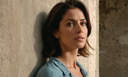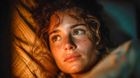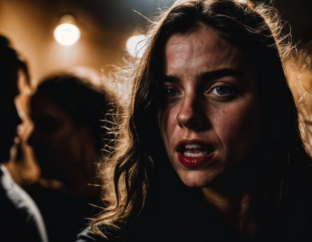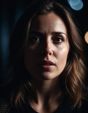 Woman with furrowed brows and worried expression looks directly at camera. Lighting is dim, casting shadows around face, emphasizing her stress. Fear, frustration, upset, worry and thoughtfulness. AI.
