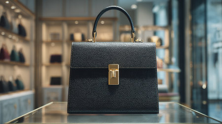 Luxurious black leather handbag with golden clasp on a retail display.