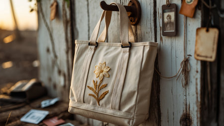 Embroidered tote bag hangs on rustic wooden wall with vintage photographs at sunset