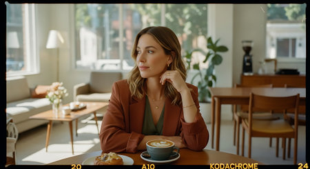A woman sits at a table in a modern cafe with a cup of coffee