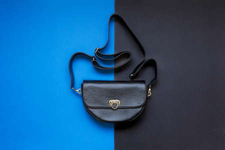 Black leather womens messenger bag with a belt on a black and blue background