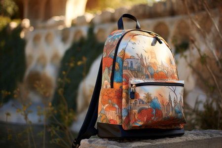 Colorful backpack with unique print design resting on a stone wall outdoors