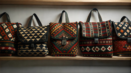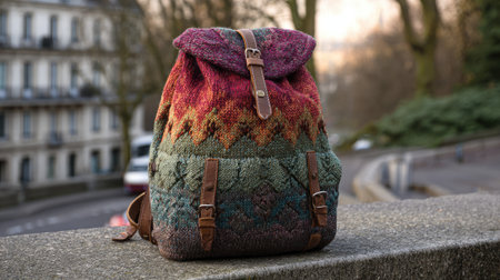 A beautifully crafted backpack featuring a vibrant pattern, perfect for outdoor adventures or daily use, blending style with functionality in a serene setting.