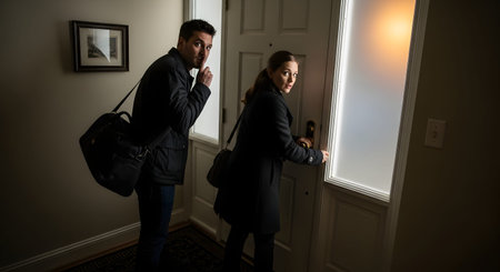 A couple quietly sneaks out the front door carrying bags, with the man making a shushing gesture to ensure silence.