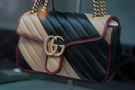 Mulhouse - France - 20 October 2019 - Closeup of leather handbag from Gucci brand in a luxury store showroom
