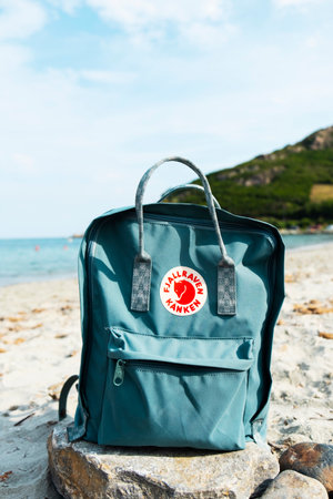 TARRAGONA, SPAIN - SEPTEMBER 16, 2018: A popular Fjallraven Kanken backpack on a rock, on a quiet beach in Tarragona, Spain. This is the best-selling product of the Swedish Fjallraven company