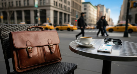 Urban scene with leather briefcase, coffee, smartphone, sunglasses, and yellow taxis