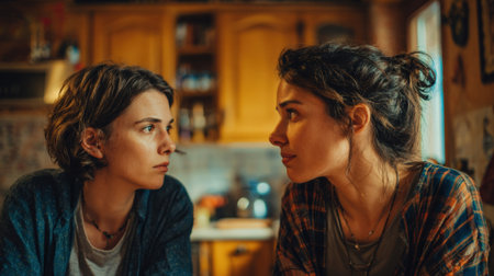 Two young women gaze intently, sharing a deep moment at home.