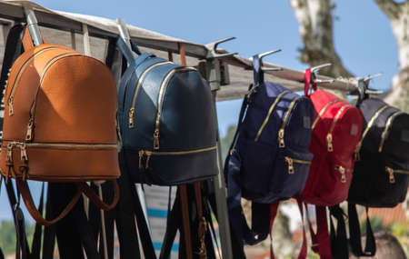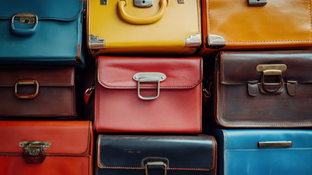 A collection of vintage leather bags arranged in a colorful display. The bags feature different shades including red, blue, and yellow, highlighting their textures and craftsmanship.