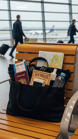 passport, tickets, map and bag on bench in airport terminal