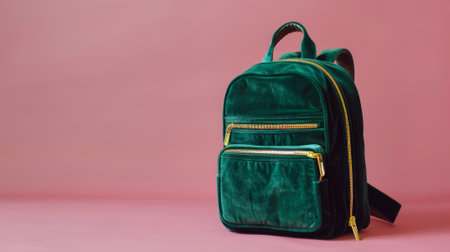 Green velvet women's backpack against pink background showcasing modern style and fashion accessory. concept of stylish travel, trendy bag, elegant design, copy space.