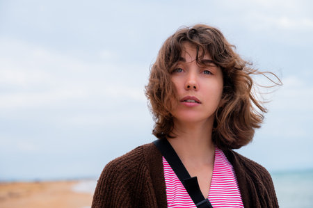 Portrait of carefree calm young woman in knitted sweater standing on sea in cold weather and closing eyes enjoying wind and sea