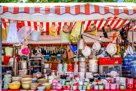 Munich, Germany - August 1: typical regional market (called Auer Dult) with stalls for household goods, crockery, textiles and clothing every three months on mariahilfplatz in munich on August 1, 2022
