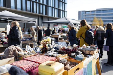 Flea market with stalls and interested buyers