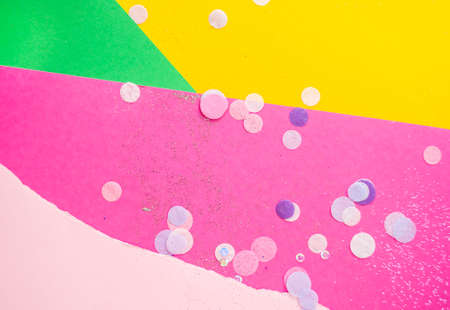 Colorful confetti, sparkles on bright pink, pastel pink, yellow and green background. Festive background.
