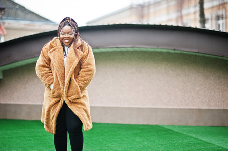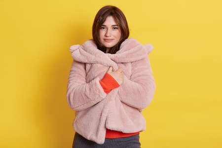 Beautiful girl wearing pale pink fur coat, feels cozy and warm, adorable female looks at camera with dreamily facial expression, posing isolated over yellow background.