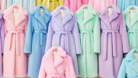 Diverse winter coats on hangers in a fashion retail environment, displaying clothing for sale and consumerism
