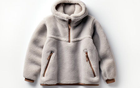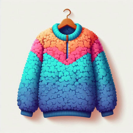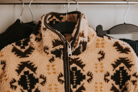 Close-up of a stylish patterned fleece jacket hanging in a closet. A cozy fleece jacket with a unique pattern hangs on a clothes rack, ready to be worn. Cozy, warm, soft items in the dressing room.