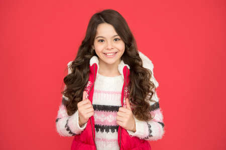happy teen girl wear warm clothes. winter kid fashion. child with long curly hair in christmas aparrel. cold season activity style. childhood happiness. thermal clothing