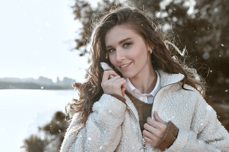 Pretty girl in stylish casual clothes stands relaxed on the back of the river on a warm winter day. Beauty, fashion, winter. Copy space.