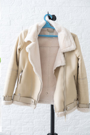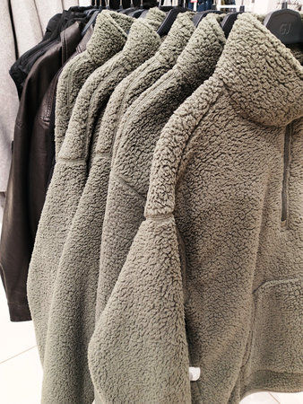 Beige sweatshirts with a warm soft collar hang on hangers in a clothing store. Fashionable trendy outerwear for the autumn season. Shopping and sale.
