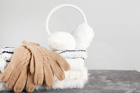 Folded knitted sweaters with fluffy earmuffs and pair of gloves on grey background