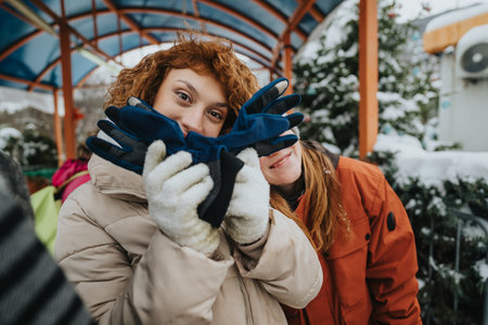 Friends enjoying winter outdoors posing playfully with gloves in a festive setting