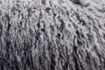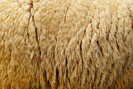 Close up of untreated sheepskin natural beige wool fiber and texture of sheep s hair fabric