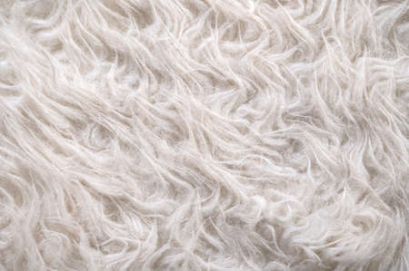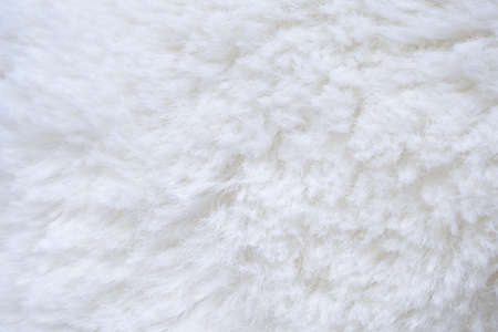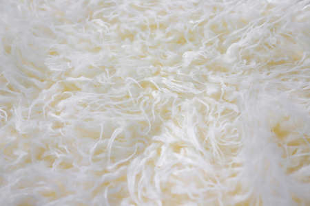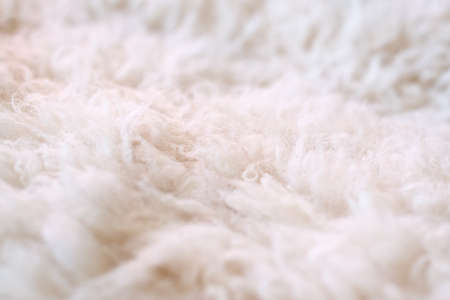 Background picture of a soft fur white carpet. wool sheep fleece closeup texture background,Fake color beige fur fabric. top view. 2019