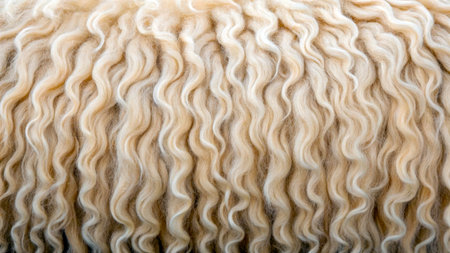 Fleecy, curly wool from a sheep showcases intricate natural patterns. The soft texture reflects light, highlighting its creamy color and distinctive waves.