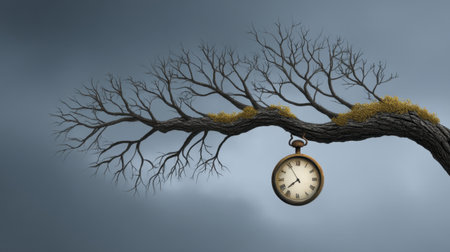 This surreal image features a vintage clock hanging from a bare tree branch against a moody sky, evoking themes of time, nature's cycle, and fleeting moments.