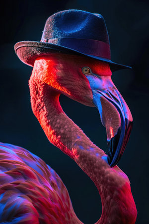 Flamingo with fedora, coral tint, backlit glow, profile close-up.