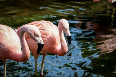 A flock of pink flamingos and reflection in the water. selective focus.