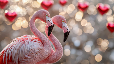 Pair of pastel pink flamingos stand gracefully against a dreamy backdrop of shimmering red heart-shaped bokeh lights, evoking romance and elegance.