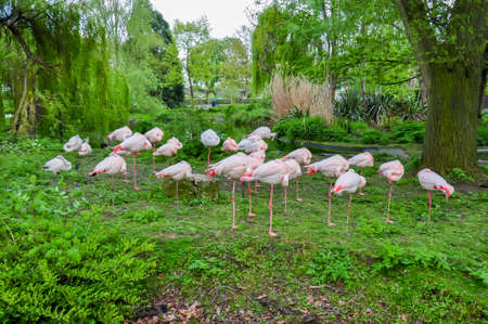 Flock of pink flamingos in London Zoo, UK