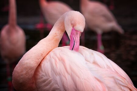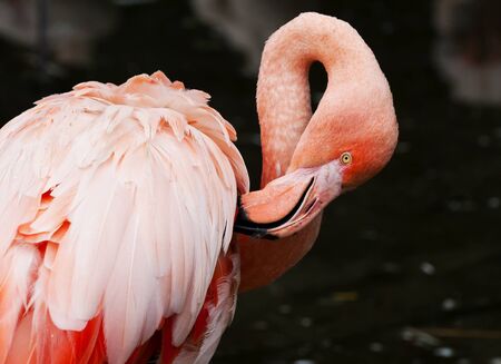 Detail of pink flamingo which plays with his feather