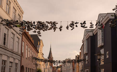 Flensburg, Germany - September 04, 2021: Cityscape with old houses and shoes hanging on wires in Flensburg.
