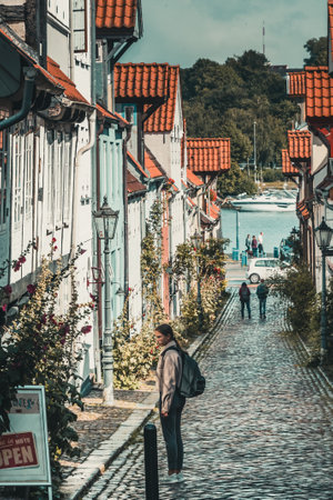 Flensburg, Germany - August 14, 2021: Oluf-Samson-Gang, a beautiful historic street in Flensburg with a view of the harbor