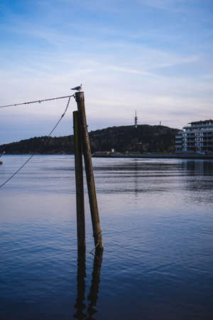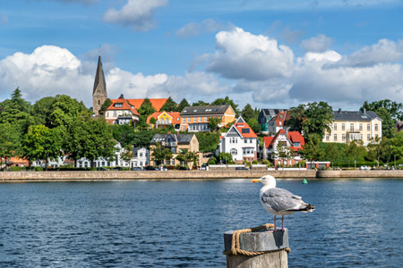 Seagull on the promenade by the sea. In the background the cityscape of Eckernfoerde, a small city at Baltic Sea, Germany