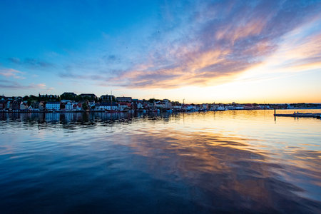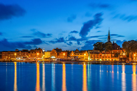 View of the skyline of the small town of Kappeln in Germany at the blue hour. The city is located on the Baltic Sea Fjord Schlei, one of the most beautiful holiday regions in Germany.