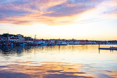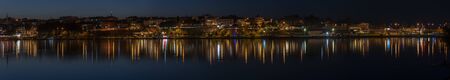 Gerze, Turkey - May 4, 2019: Panorama of the city og Gerze with harbor and Black Sea during dusk and night with many lights and reflections in the water.