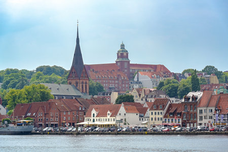 Flensburg, Germany, July 25, 2022: Flensburg at the fjord, cityscape with St Marien church, the old gymnasium and town houses under an overcast blue sky, copy space, selected focus