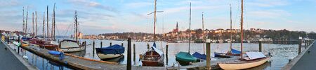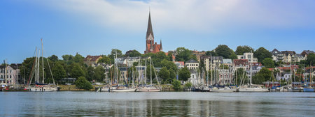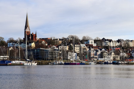 Flensburg panorama, skyline of the city on the east side of the fjord with St. Jurgen church, town houses and sailing ships on the pier in the yacht harbor, overcast blue sky, copy space, selected focus