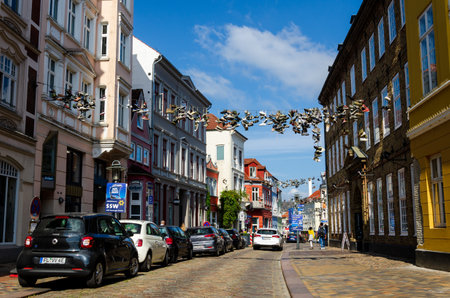 Flensburg, Germany - 18 February 2023: Old architecture in the streets of Flensburg on a sunny day