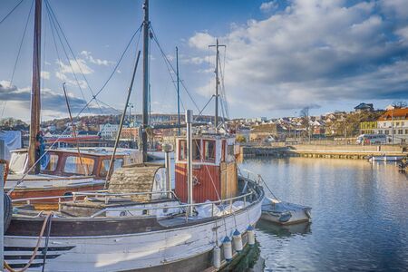 Boats and yachts tied up with ropes to a pier. Norway, Sandefjord.