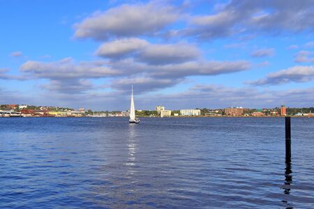 Flensburg, Germany - September 04, 2021: View of the harbor and city of Flensburg, east shore.