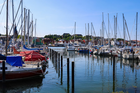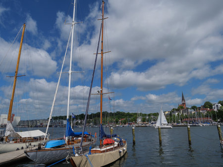 Sailboats mooring in the picturesque harbor of Flensburg, Germany, under a bright blue sky on a delightful summer day