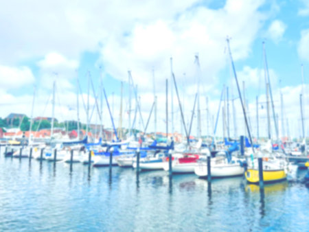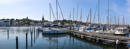 Many sailboats moored at the docks with Flensburg cityscape in the background on a beautiful sunny day
