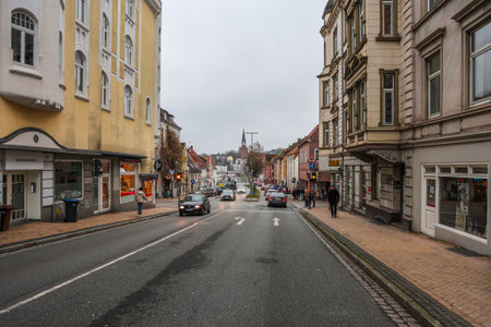 Flensburg, Germany - 21. December 2025: Flensburg city street view with traditional buildings and cars driving on a cloudy day